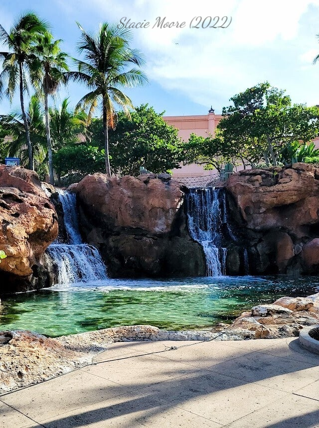 Atlantis Resort, Nassau, Bahamas. This photo was taken on a beautiful day in October 2022. The waterfall, large rock formations, and the perfect blue skies are a spectacular sight.