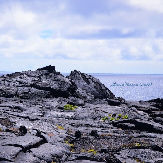 Close-up of Lava, with the tranquil ocean in the background and beautiful sky above.