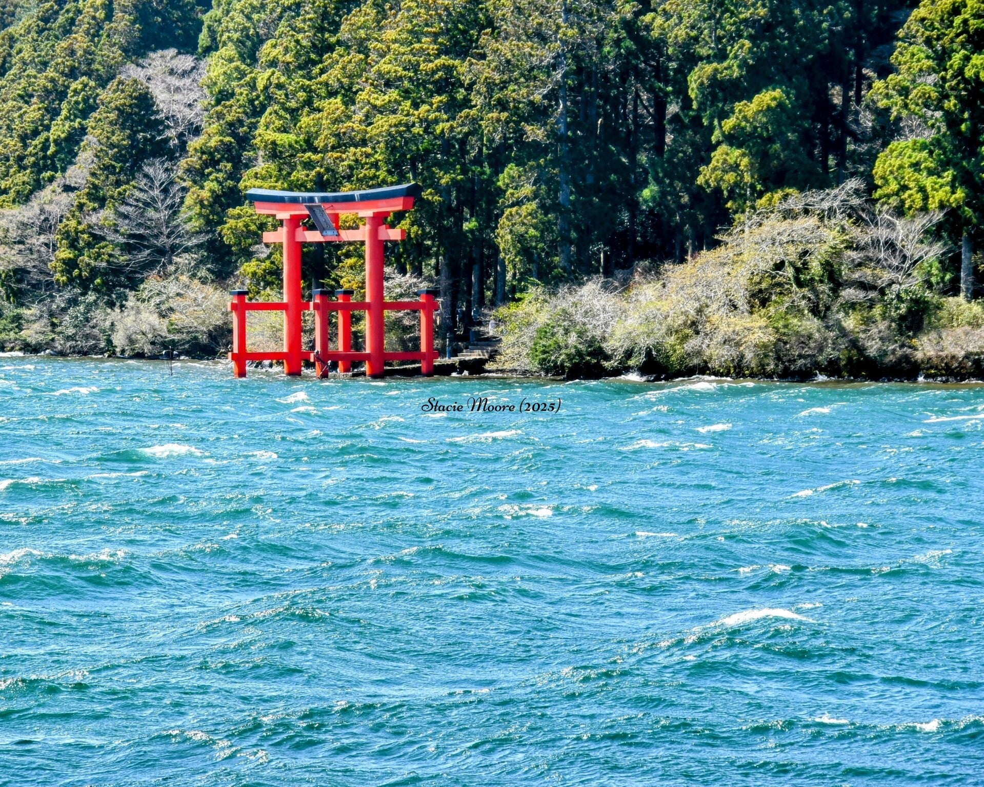 The tour this time was a bit more relaxed. It consisted of a bus ride to Hakone, a town about 2 hours from Tokyo. We were scheduled to ride a cable car up to the top of Mt. Hakone, which would enable a perfect view of Mt. Fuji, but unfortunately, that was canceled due to high winds. We, however, were able to view Mt. Fuji from a ferry ride along Lake Ashi. The ferry ride was very windy and quite chilly. We stayed inside the majority of the ride, only stepping outside briefly to get a better view and a few photos.